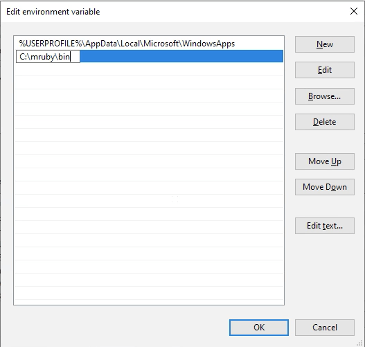 Edit Path and add mruby installed folder’s bin (Eg: c:\mruby\bin)