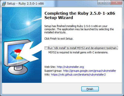 Make sure to uncheck Run ridk install’ to install MSYS2 and development toolchain on Completing the Ruby xxxx Setup Wizard